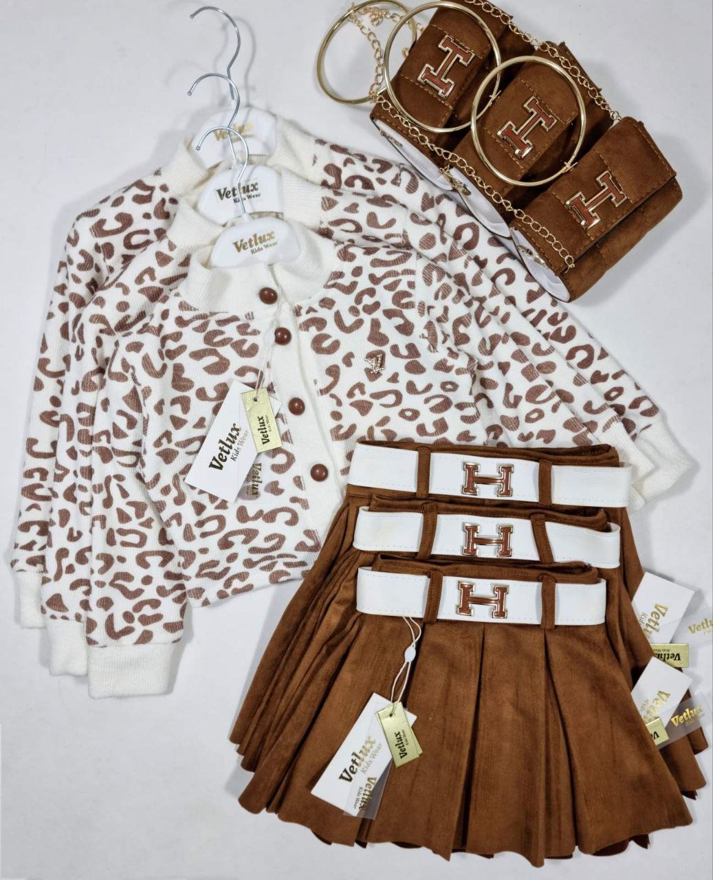 هل تبحثين عن إطلالة لابنتك تجمع بين الأناقة والعصرية؟ طقم بنات ليوبار هو الخيار المثالي لكِ! يتألف من سترة رائعة بنقوش الفهد المميزة، مع تنورات متعددة الطبقات بلون بني جذاب، مما يمنحك إطلالة مفعمة بالأنوثة.